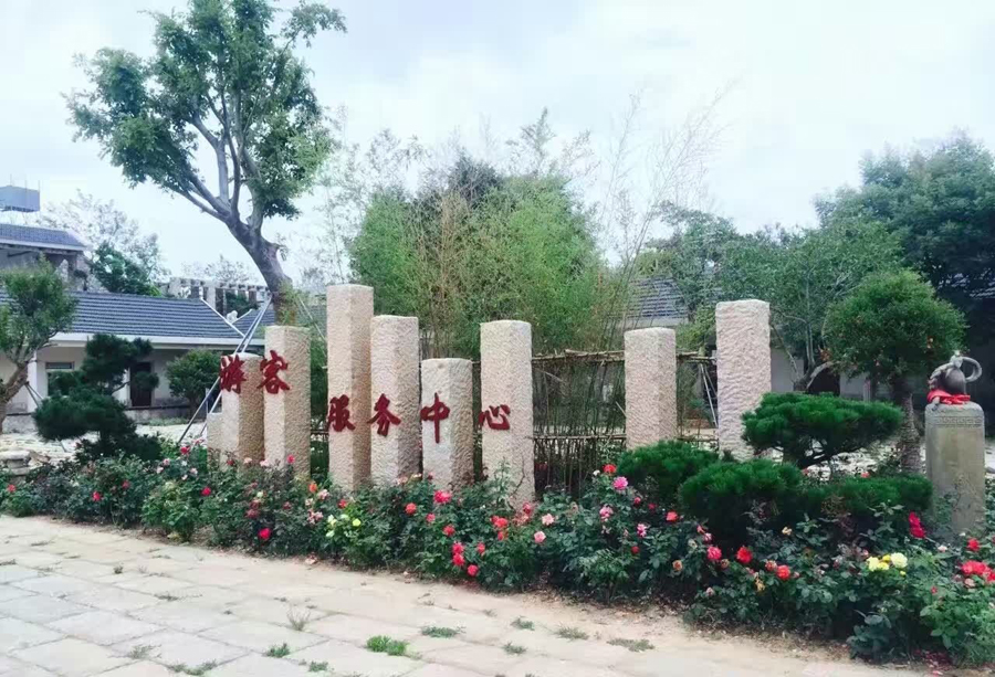從主園路看游客中心南廣場(chǎng),主園路兩側(cè)栽植的造型日本羅漢松,增加迎賓同時(shí)也表達(dá)徐福東渡日本的歷史文化。北側(cè)有徐福像。
